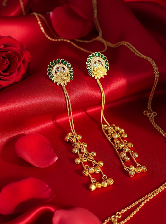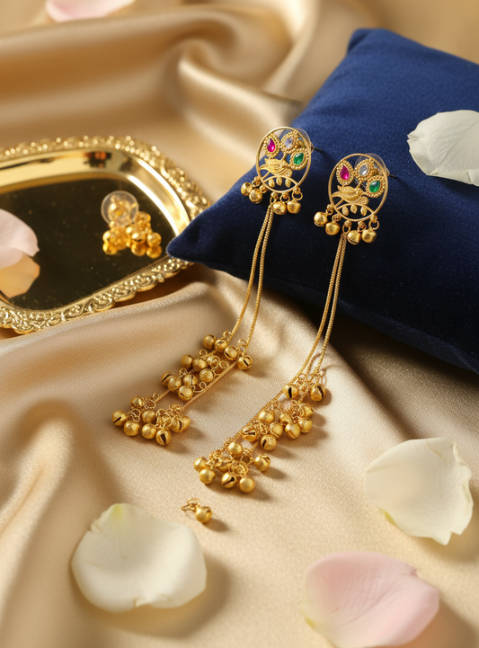 Enchanted Peacock Paradise Earrings with Golden Ghungroo Waterfall