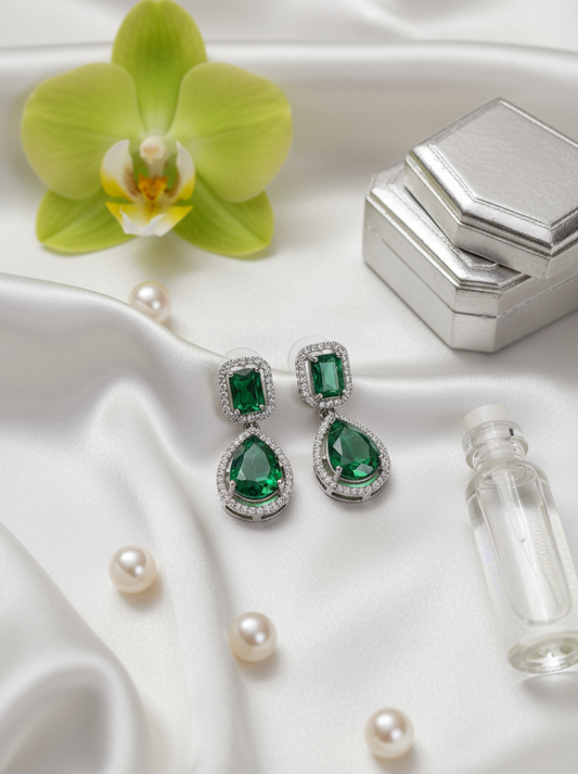 Emerald Dual Drop Halo Earrings