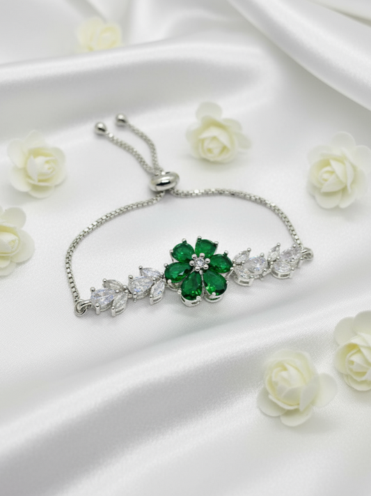 Emerald Bloom Adjustable Silver Bracelet with Cubic Zirconia Leaves