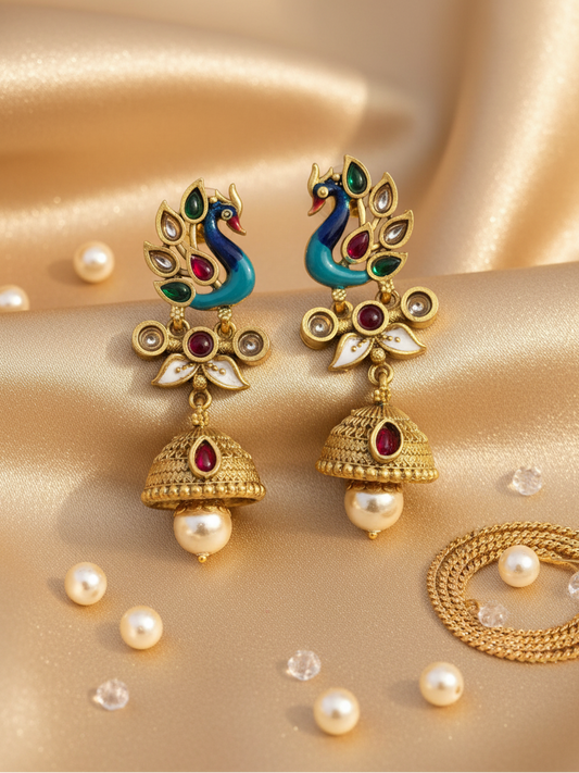 4.9 (52)Royal Peacock Jhumka Earrings with Pearl Drops